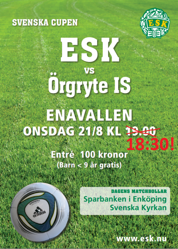 Hjälp oss att göra Enköpingsborna medvetna om att det väntas cupmatch på onsdag mot anrika Örgryte, sprid matchaffischer på jobbet, den lokala affären mm. Klicka på länken nedan för att ladda hem matchaffischen, skriv ut och affischera. Tänk på att be om lov eller använda platser avsedda för affischering.